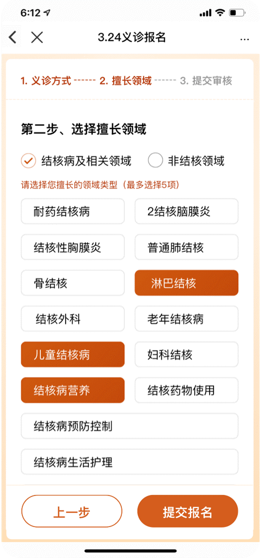 4、在义诊报名页面选择您的义诊形式及擅长领域,点击下方“提交报名”按钮即可完成报名。
